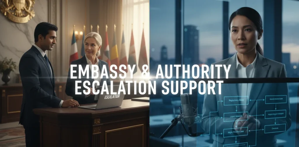 When required, we assist in preparing escalation communications to embassies or higher authorities. This includes drafting formal representations and guiding you on appropriate escalation channels based on your case type.